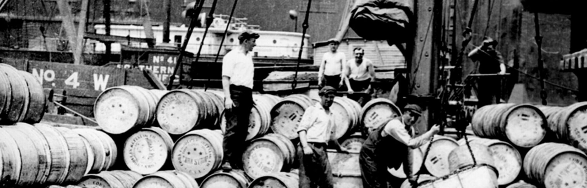 (Image: Longshoremen on a New York dock loading barrels of corn syrup onto a barge on the Hudson. Photograph by Lewis Hine. c. 1912 [Public Domain])