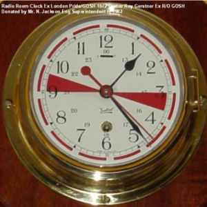 Radio room clocks were different from other ship’s clocks. They had two three-minute time zones shaded in red, from 15-18 minutes and 45-48 minutes in each hour. During these three-minute periods, all radio operators ceased transmitting and switched to the 500kHz distress frequency and listened for any distress calls.